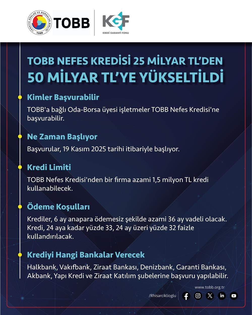 2 Ekim 2025 tarihinde başlayan TOBB Nefes Kredisi’nin ikinci paketinde 25 milyar TL olan kredi hacmi 50 milyar TL’ye yükseltildi.